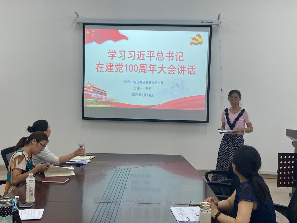 2021年7月13日下午,综合、物理教研室联合党支部书记宋萌在球速体育会议室,结合习近平总书记在庆祝中国共产党成立100周年大会上的重要讲话,为全体党员上专题党课。